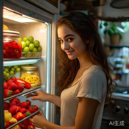 接着,她又开始翻找起水果来。我注意到,她的冰箱里不仅有各种水果,还有她亲手做的果酱和酸奶。看来,校花妹妹不仅颜值高,还会自己动手做美食呢!
